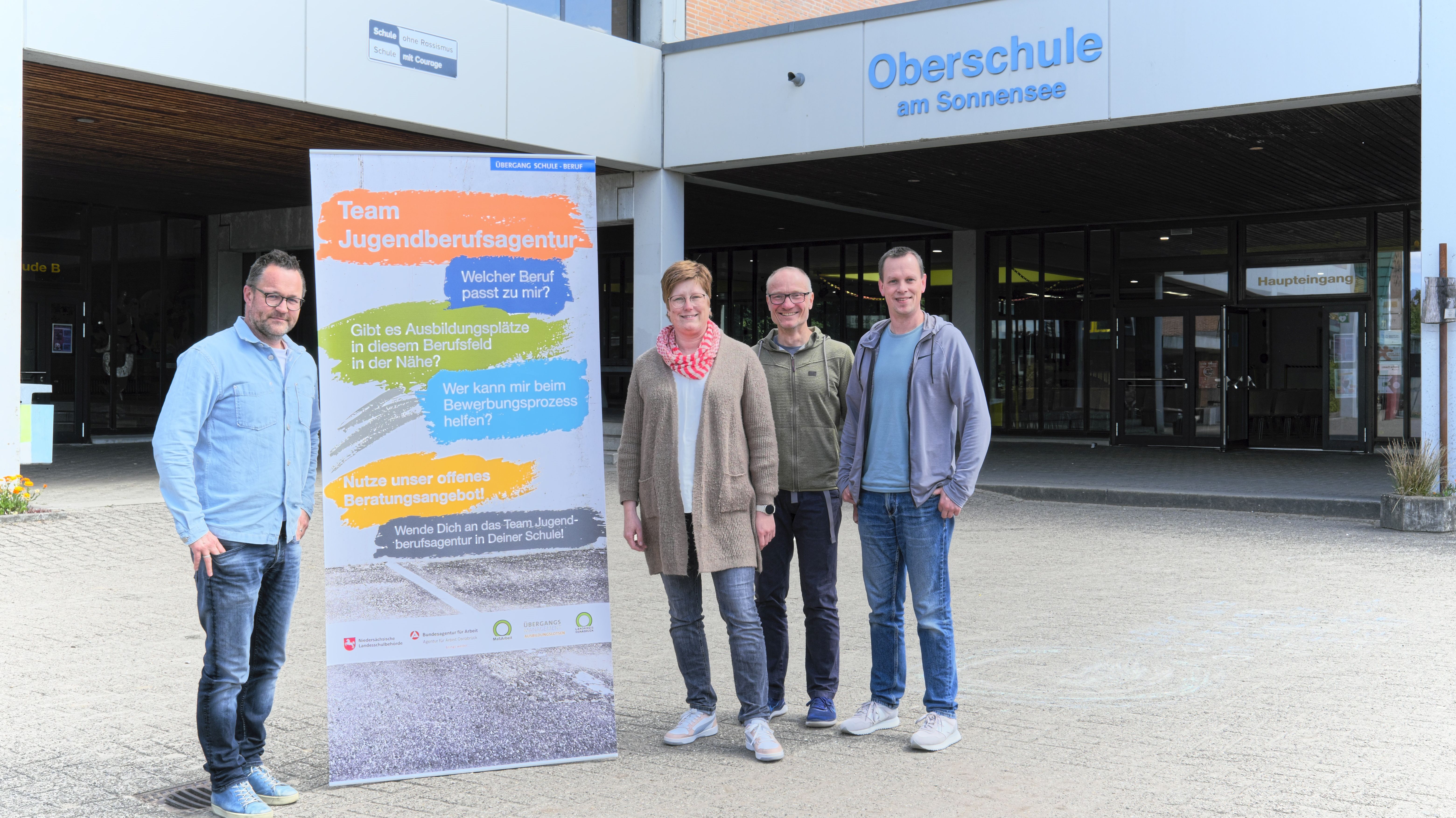 Das Team Jugendberufsagentur an der Oberschule am Sonnensee in Bissendorf: Berufsberater Martin Anker von der Agentur für Arbeit, Ausbildungslotsin Christina Kursch vom Übergangsmanagement Schule-Beruf der MaßArbeit, Schulsozialarbeiter Michael Suchy, sowie Lehrer und Berufsorientierungsbeauftragter Jan Funke